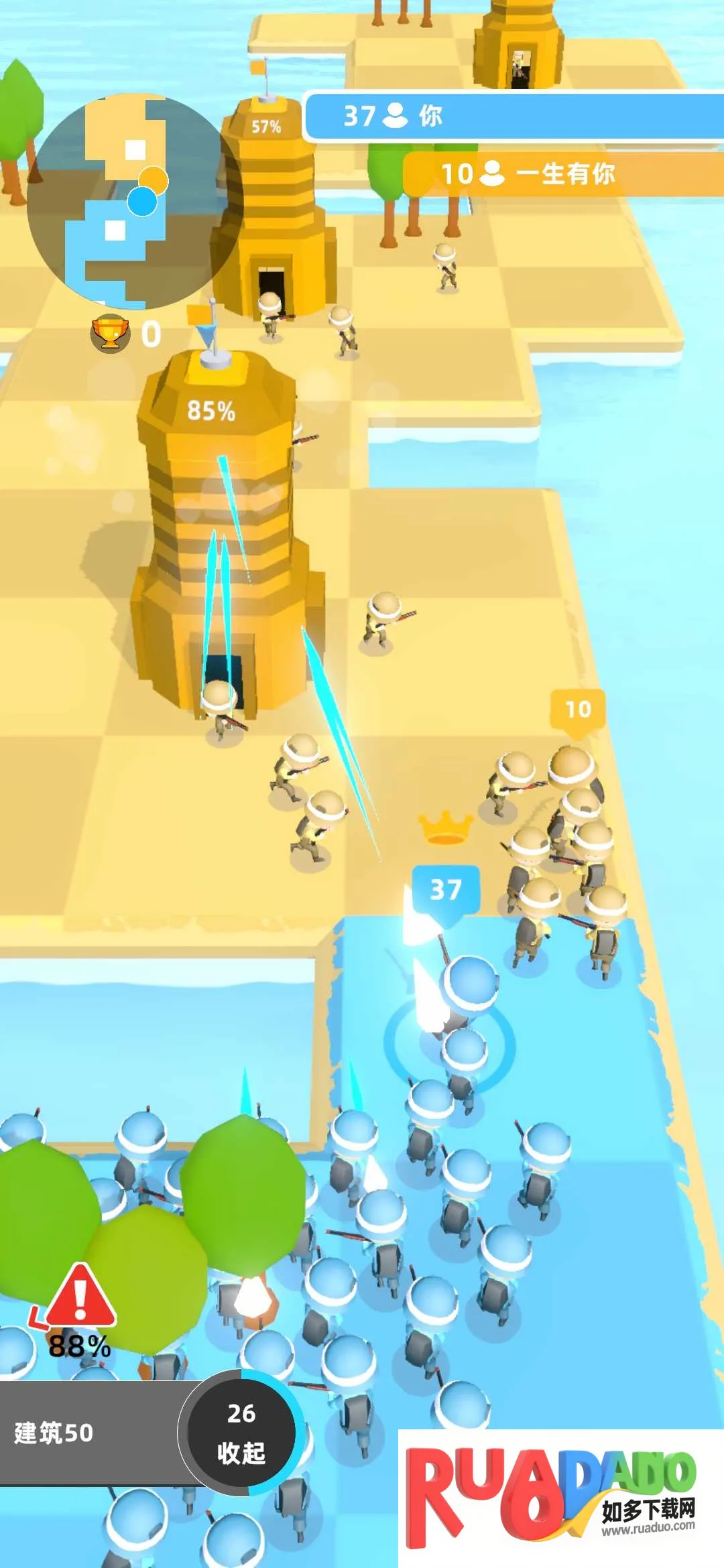 3、各兵种联合对战,指尖合并模拟战争PK。