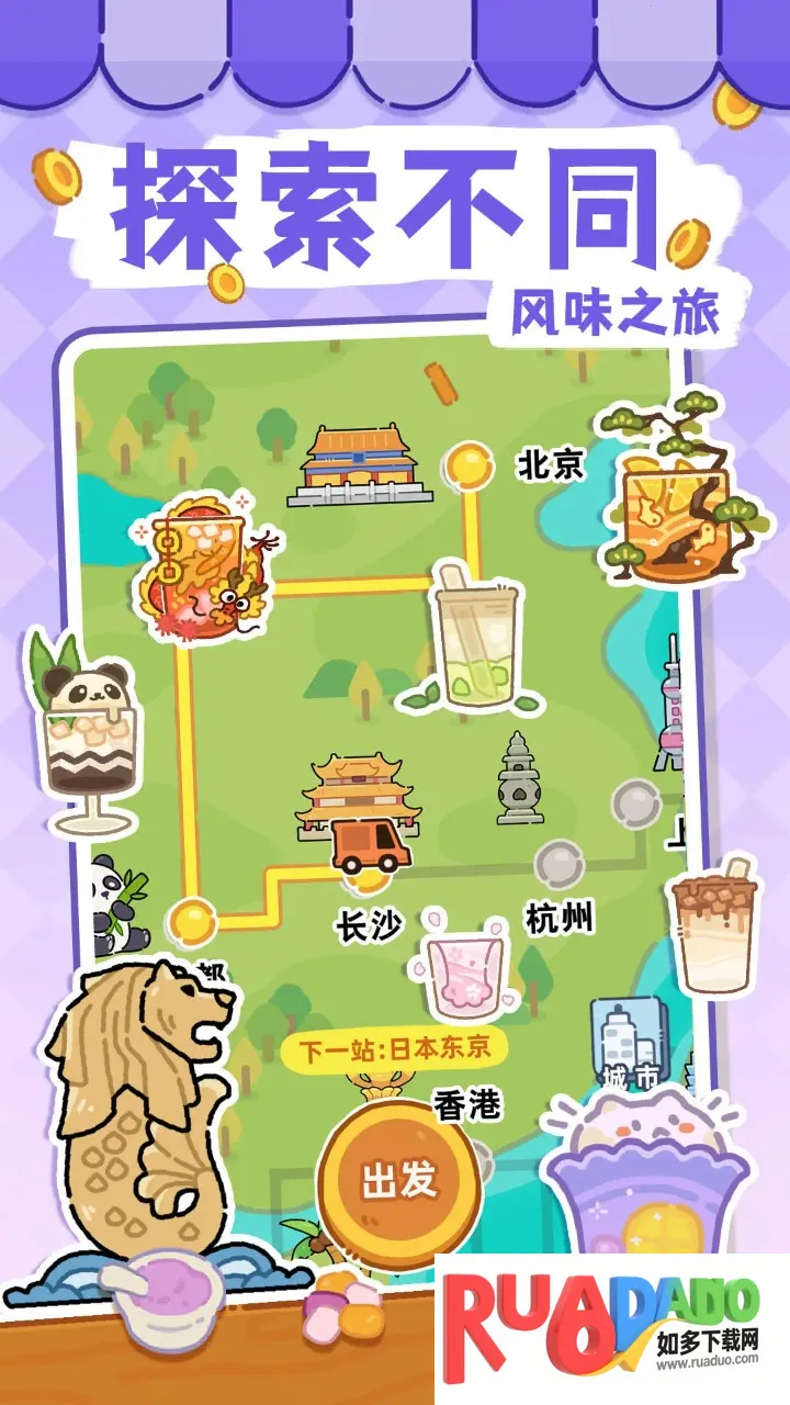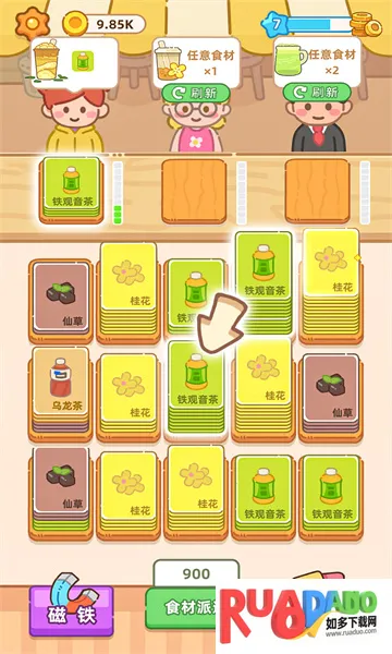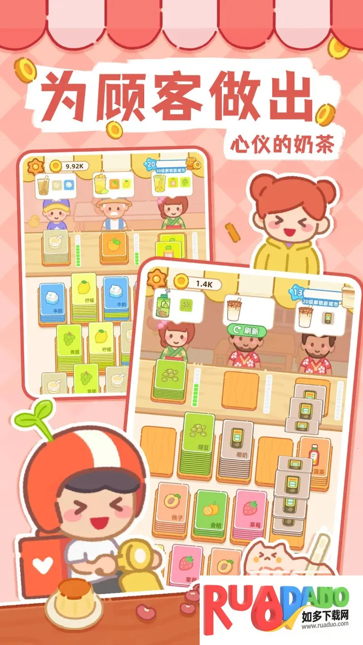 3、游戏玩法丰富,不仅要合理排序整理食材、提交正确原料卡牌制作奶茶,还能自由装修店铺、扩张规模、拓展业务范围等。