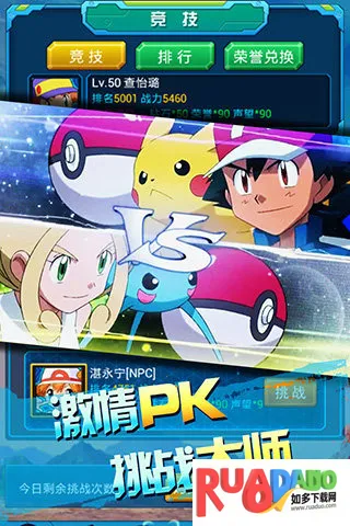 4、竞技性强,独创排行榜系统,能和全球玩家同台比拼,还可挑战道馆、参与竞技成伟大训练师。