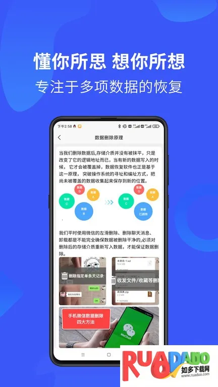 4、性能出色:兼容性强,适配所有安卓手机,采用深度扫描和检测技术,能找出删除碎片和清空文件,还提供工具盒子,且所有恢复工具免费使用。