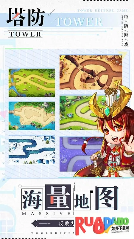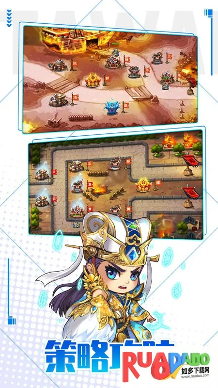 2、游戏场景画面清新简约,融合多种经典玩法,如闯关战斗、强度养成、征战讨伐等,推图刷本乐趣无穷。经典结合创新的炮塔塔防设定,将防御塔转换成更具灵动的武将小人,较传统塔防更具策略性和趣味性。