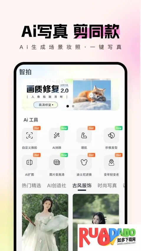 智拍(AI影像制作)是一款功能丰富的应用软件,支持一键体验多样玩法。有海量模板每日上新,可随心添加魔法滤镜。能制作AI写真、证件照,还能智能消除背景、精准抠图,快速生成精美大片并高清保存。