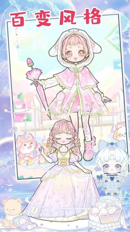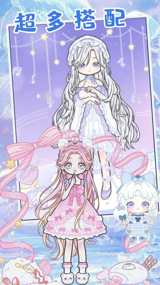 1、游戏具有二次元萝莉少女风格,带来多种娃娃角色和丰富服装服饰,可打造多样时尚风格,如可爱公主风、酷炫风等。