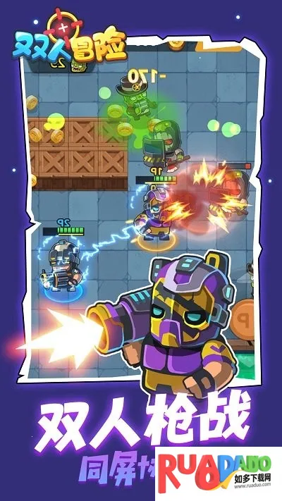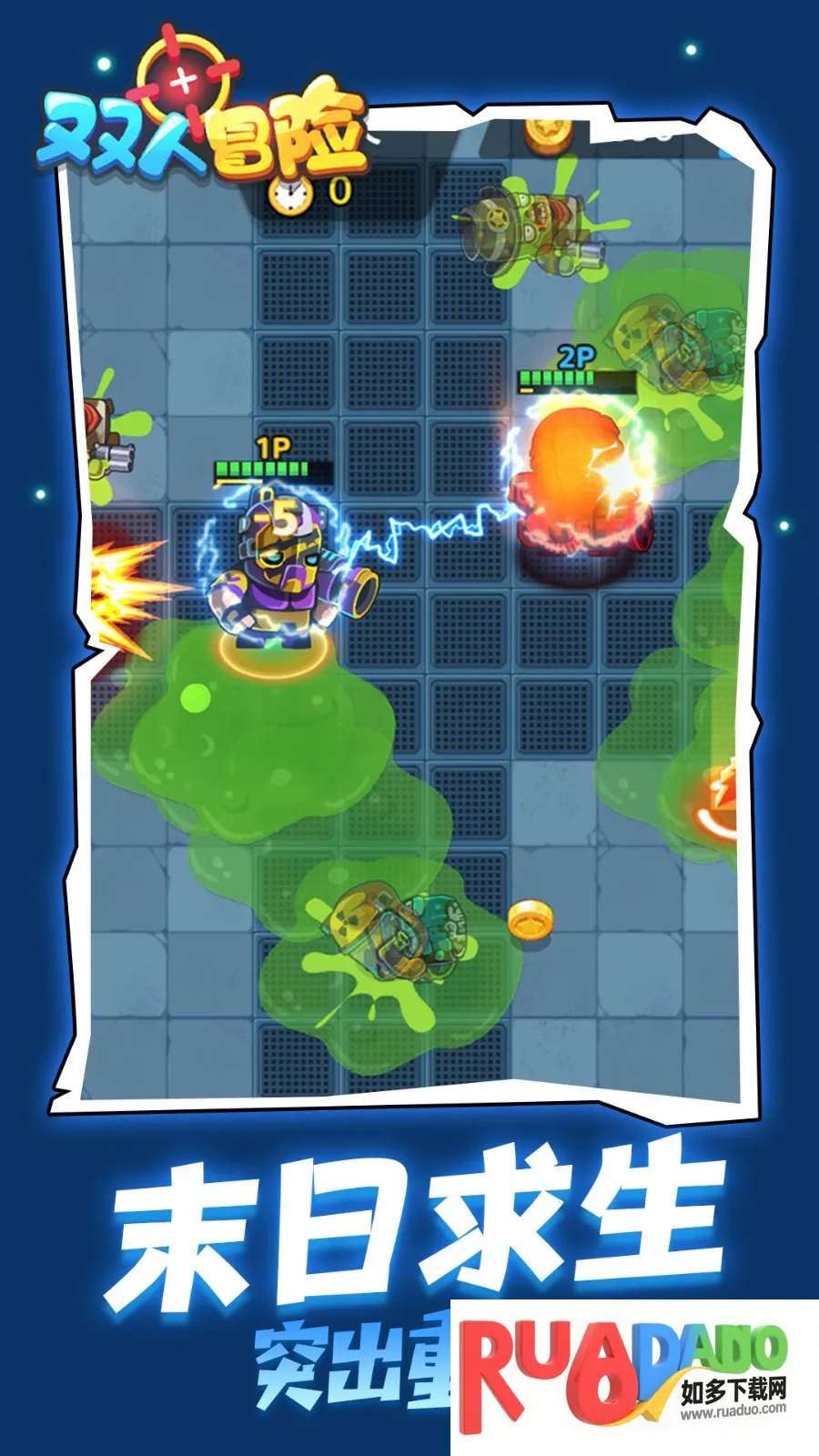 双人冒险是一款双人同屏的末日题材枪战游戏。2122年生化病毒泄露,幸存者组建部队对抗丧尸。游戏采用Q萌画风,有众多角色与武器可选,支持联机合作,操作简单,战斗刺激,还能获丰厚奖励。