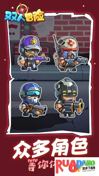 1. 双人冒险(双人枪战游戏)是末日题材的动作射击游戏,采用卡通q萌形象画面,有众多不同角色可供选择。