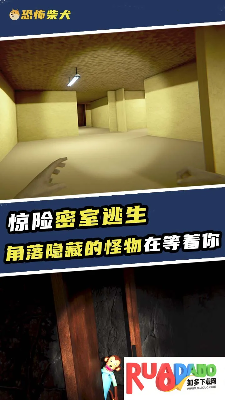 2、在恐怖密室里需快速闯关、搜集武器,躲避柴犬追捕,还要打败困难迷宫,每个角落都可能有可怕怪物。