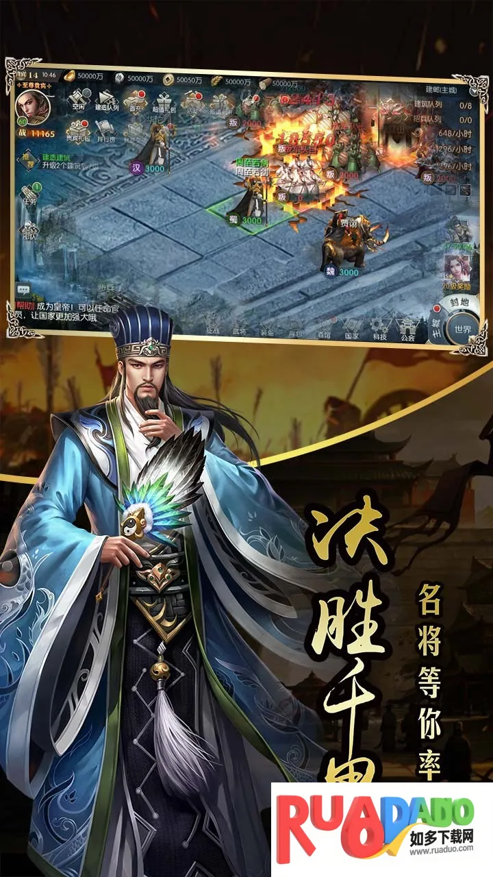 2、三国策略博弈:在三国乱世中,玩家与同势力兄弟谋划,借名将助战扩大实力领土,需从个人到国家层面进行战略规划。
