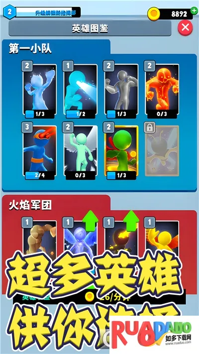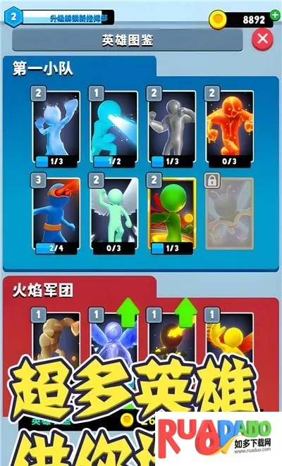 3、通过收集英雄卡片升级属性,同时建造升级指挥部,解锁后及时解锁特色英雄,丰富战队战术选择,还能组建双英雄战队,利用技能搭配提升闯关效率。