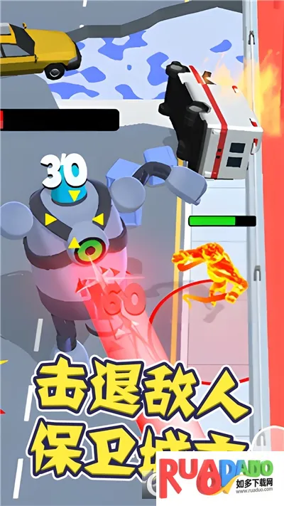 4、特色玩法丰富,用首局奖励升级镭射眼攻击属性并兑换防护道具;解锁指挥部后立即解锁特色英雄组双英雄战队;面对密集怪兽关卡,先用范围攻击道具清场再操控英雄躲避残余敌人。