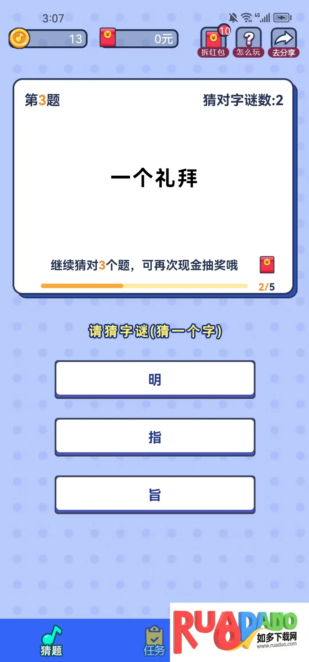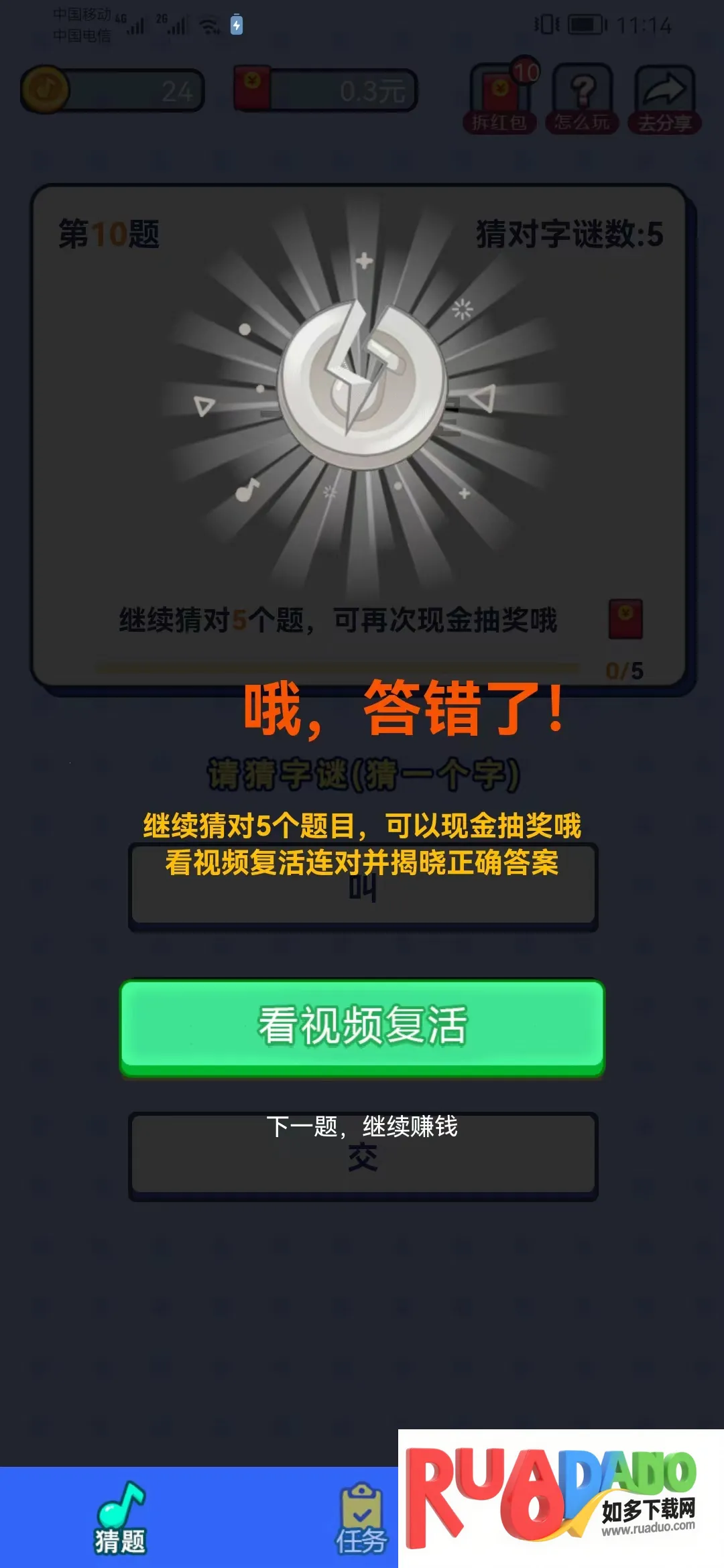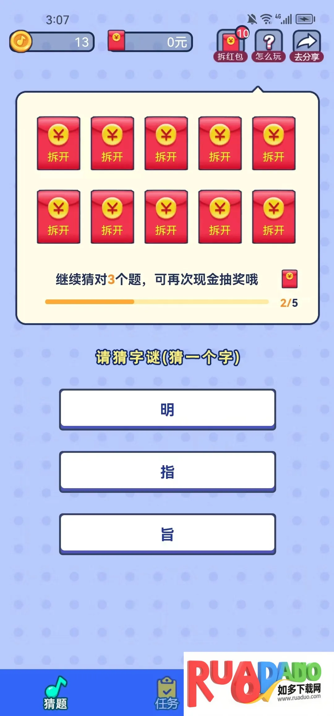 2、奖励丰厚,每通过一关可获相应奖励,完成整个题库挑战能领取现金红包,完成10个字谜挑战可得0.3元红包,活动支持循环答题领红包,过关无需强制看广告。