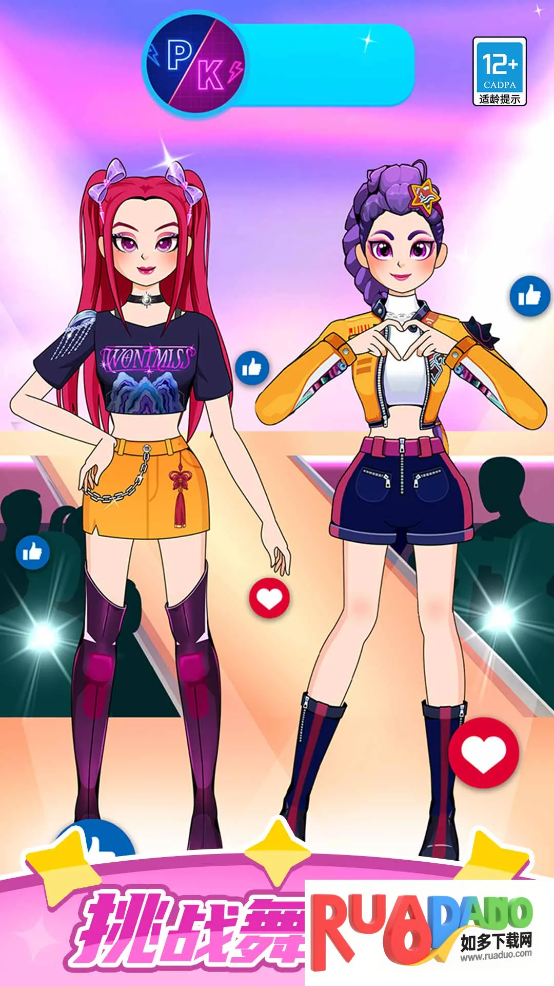 2、游戏玩法丰富,根据关卡主题选服装搭配,完成挑战可解锁新玩法和服装品类,完成搭配后系统展示整体效果,还能通过点击爱心按钮评分。