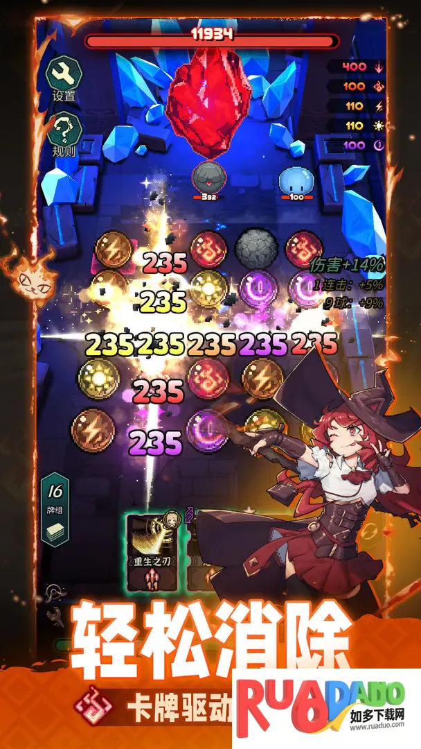 2、游戏采用三消战斗机制,融合卡牌驱动与三消玩法,操作简单且策略丰富;有多样卡牌可供收集,每张卡牌技能属性专属。