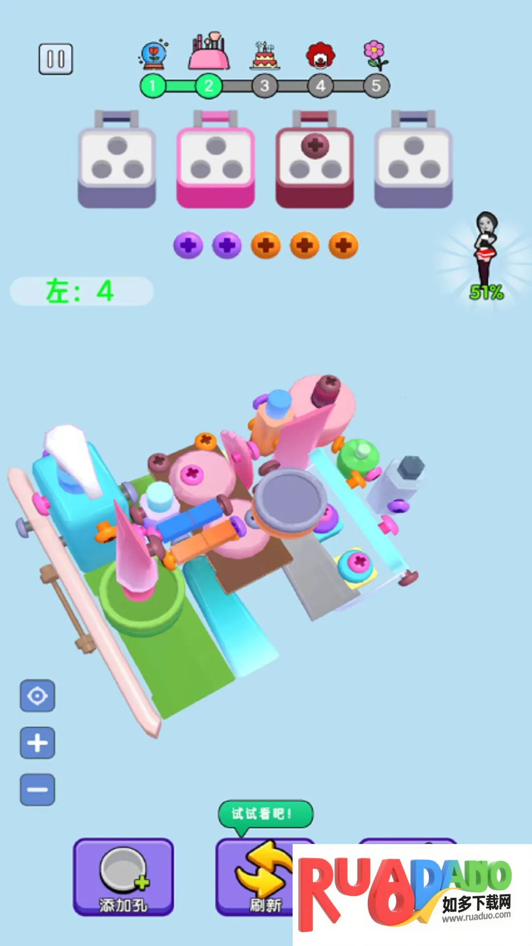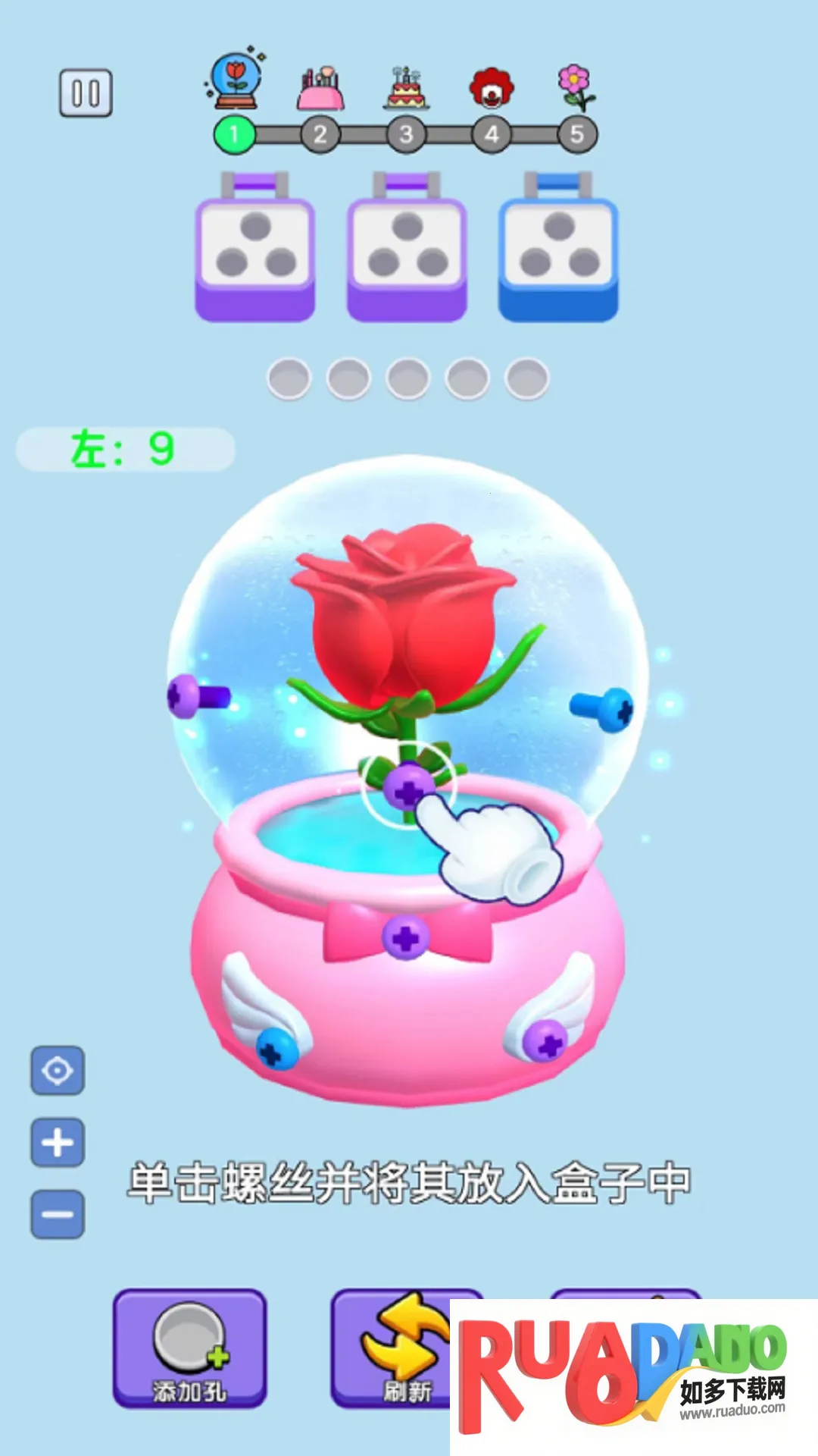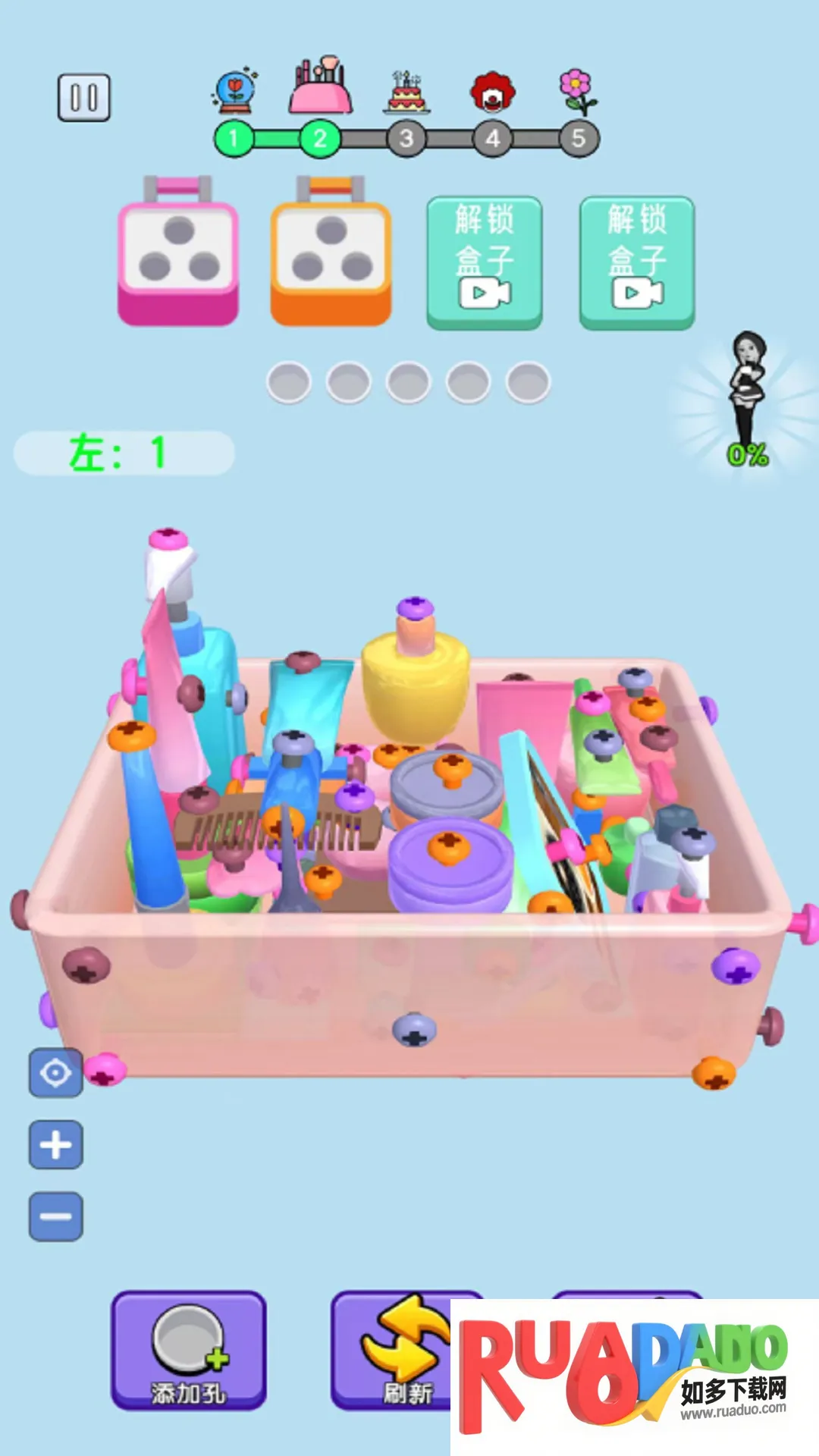 2、玩法多样,可根据关卡提示点击对应颜色螺丝放入收纳盒通关;遇到复杂结构观察支撑关系,优先拆除承重螺丝;操作失误能用刷新道具重置关卡;后期关卡有复杂结构,要先分析整体框架。