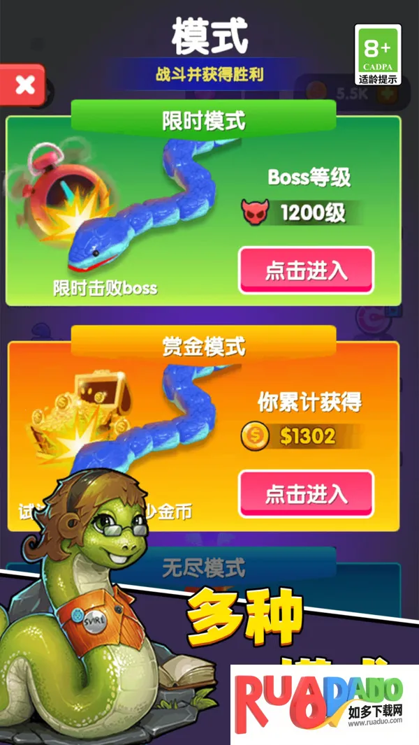 1、游戏玩法丰富,开局操控巨型机械蛇,靠吞噬能量块维持生命与增长体型,还有经典、团队竞技、无尽深渊等多种模式,不同等级解锁。