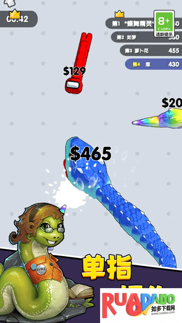 1、游戏规则简单,操控小蛇吃豆子增长体型,遵循大鱼吃小鱼法则,躲避大蛇、吞噬小蛇,稳健发育积累实力才能称霸全场。开局操控巨型机械蛇,吞噬能量块维持生命和增长体型,新手礼包有7天限定皮肤和双倍经验卡。