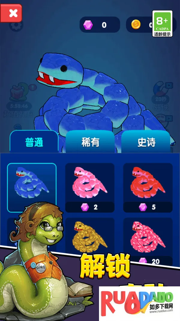 3、亮点突出,蛇身皮肤可高度自定义,隐藏区域有惊喜彩蛋,好友联机对战系统完善,昼夜交替影响战术。