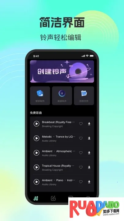 2、在平台首页可轻松创建铃声,免费歌曲能直接点击聆听,查看音乐列表便捷高效,还能制作语音铃声,听歌方式更简单。