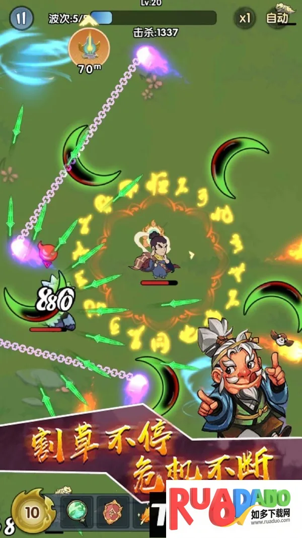 《转刀大师2025》是一款休闲策略roguelike游戏,玩家控制鸠摩大侠收集转刀,消灭怪物与修仙者。游戏场景丰富,战斗画面华丽。可解锁旋转刀、搭配随机技能挑战BOSS,还能升级角色、打造法宝,玩法多样有深度。