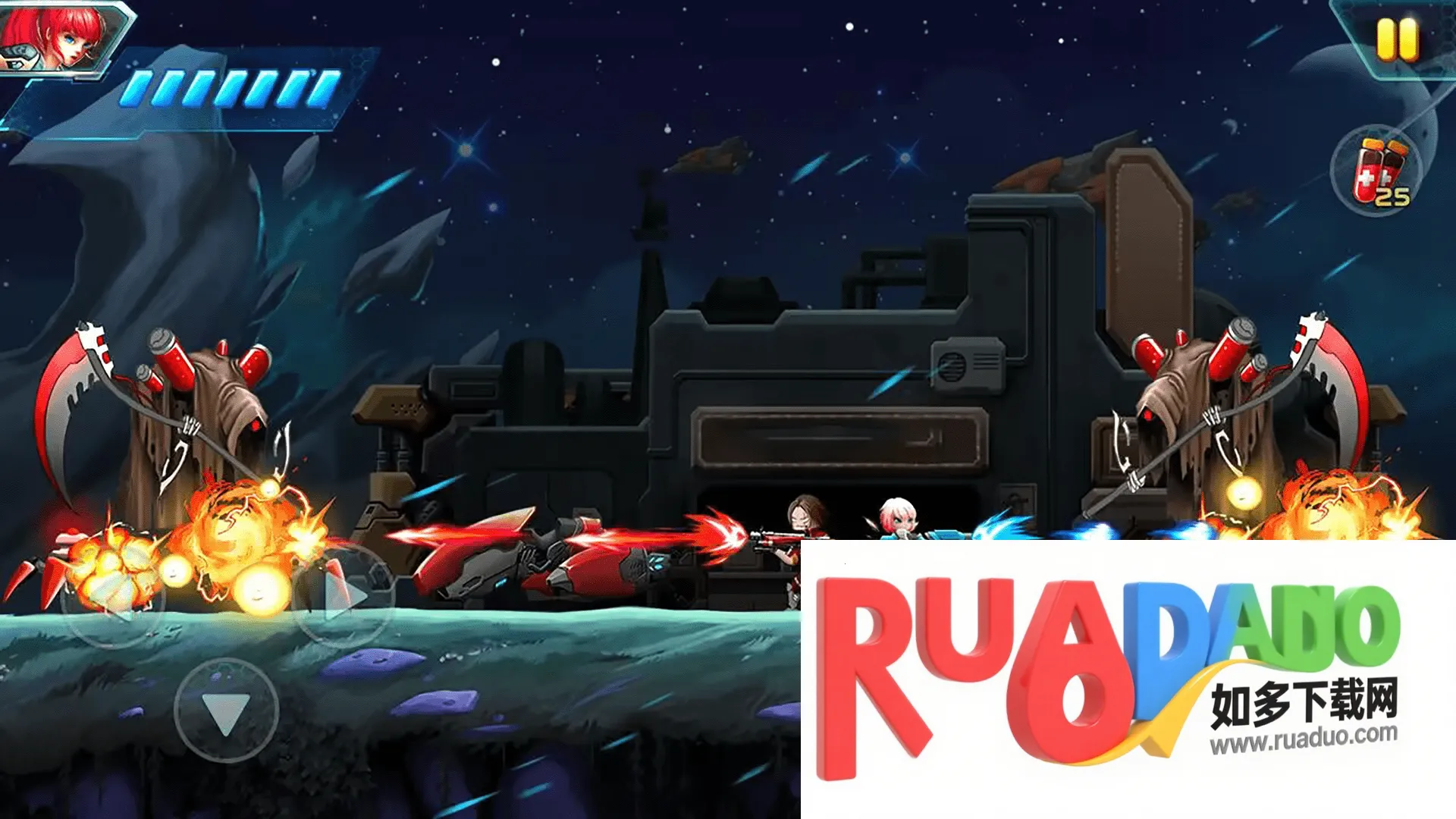 4、游戏初始装备是普通冲锋枪,支持八方向射击,获取强化武器后会替换当前装备。击破场景中的橄榄形飞行物可获得武器强化效果,但角色死亡后强化状态会重置。