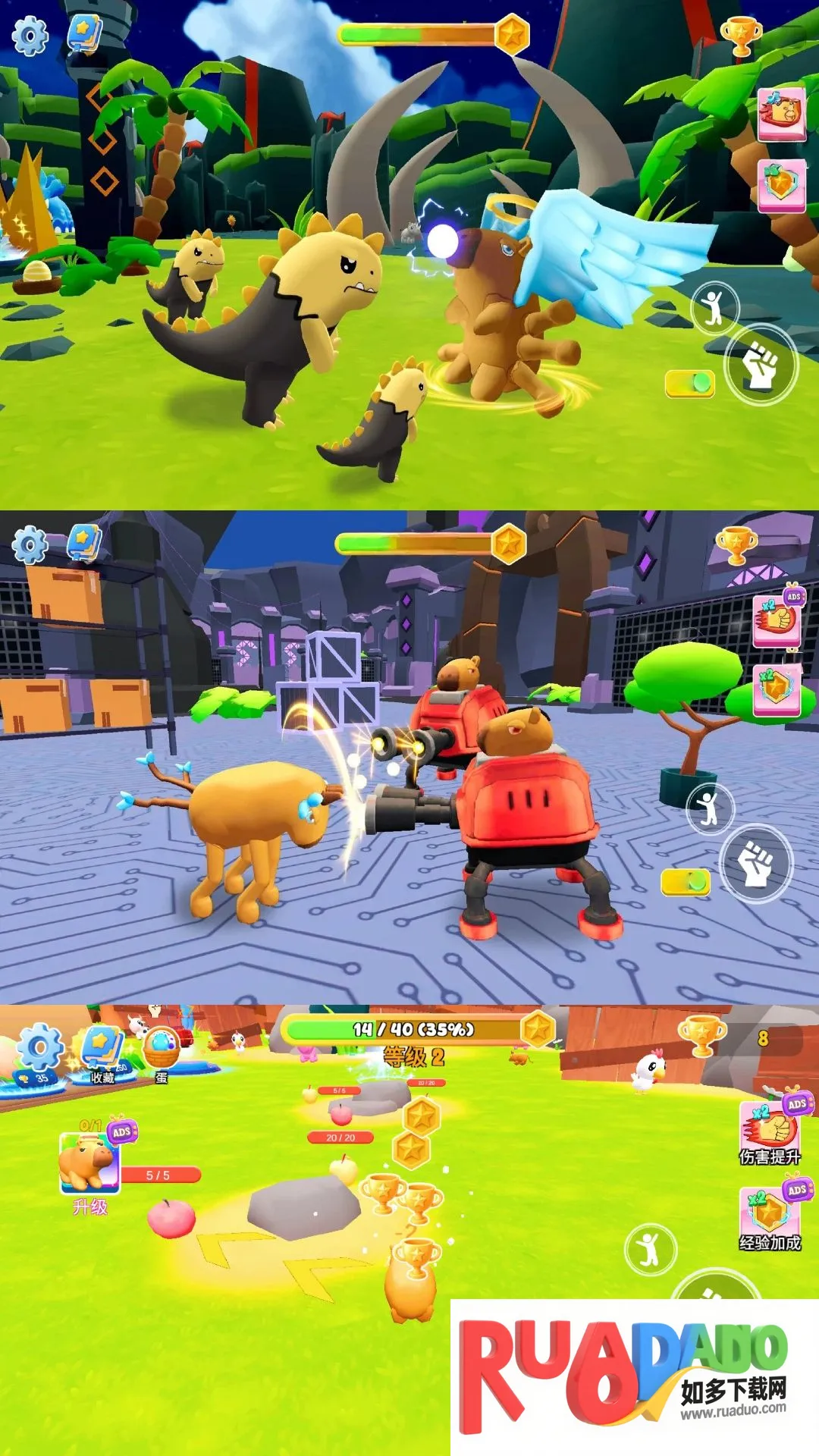 2、战斗进化玩法:玩家化身呆萌水豚,在动态环境中战斗与进化,通过击败敌对生物获取经验,实现生命形态蜕变,每次进化解锁新生存能力,构建生物进化图谱。