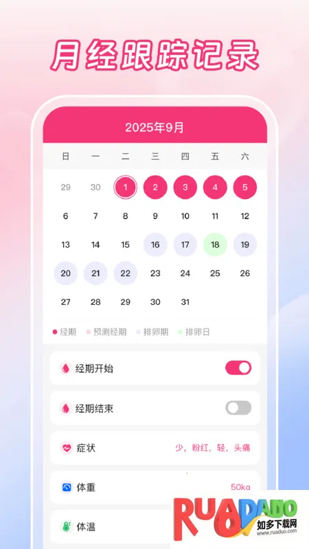2、使用简单,在记录页面结合日历添加,手动记录经期时间和症状并录入数据即可快速存储,科普页面还能轻松浏览健康知识。