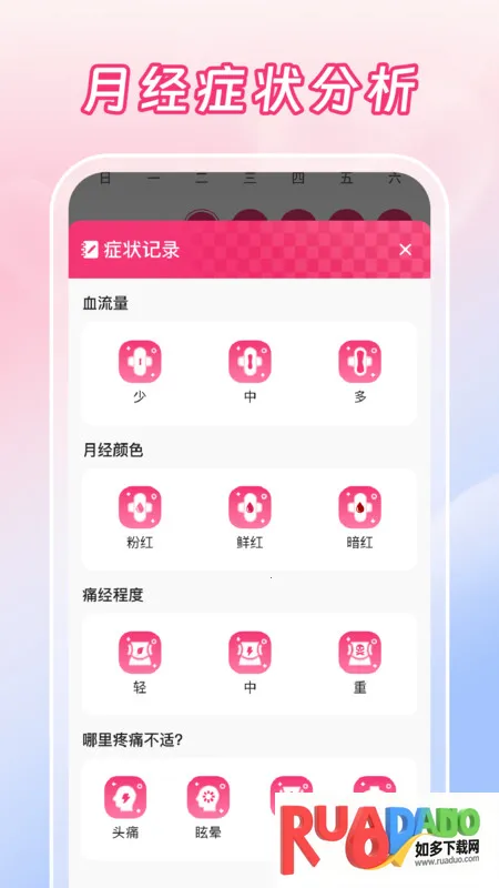 4、具备贴心的症状分析和实用建议,数据保密安全,可设置提醒,支持记录心情和卫生用品使用情况,还有专属健康小贴士、添加备注和周期总结等功能。