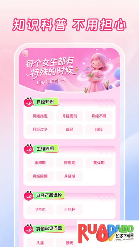 3、知识丰富,涵盖从经期缘由到身体调理等多方面科普内容,还能实时获取权威健康小贴士。