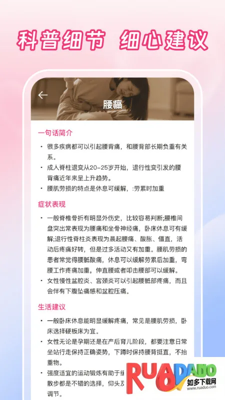 2、建议实用,针对不同症状,告知吃什么、做什么运动,轻松应对。