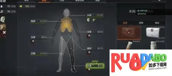 当口袋和弹挂中有医疗物资时我们可以快捷使用,但这样无法指定部位优先治疗,如果遇到医疗物资有限,身体又多处损坏的情况,可以打开背包后切换到健康页面针对各个部位进行治疗,比如先治疗腿部损坏,恢复移动能力。