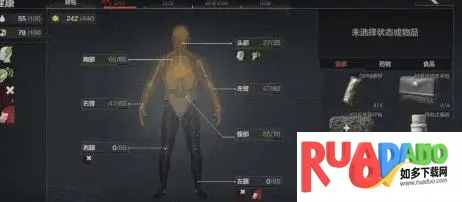 影响生存的数值有血条,伤痛,缺水和缺食,大家要时刻注意这些数值,并使用与之对应的消耗品保持自身的状态稳定。如果肢体击中变黑,将影响自己的移动速度!