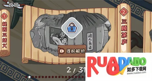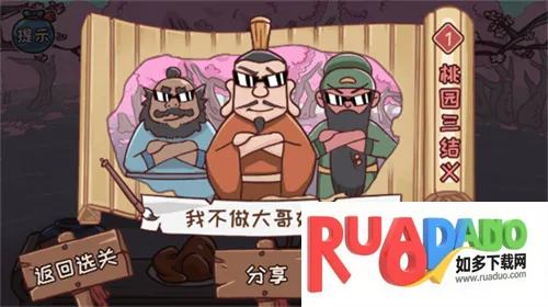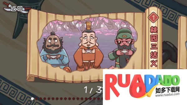 1、画面有趣且无厘头:能看到刘备在桃园发愁找不到桃树,满屏无厘头道具,需用脑洞帮他解开难题,如把鸡毛掸子变成假桃树,关羽用青龙偃月刀修剪,搞笑剧情随解谜展开。